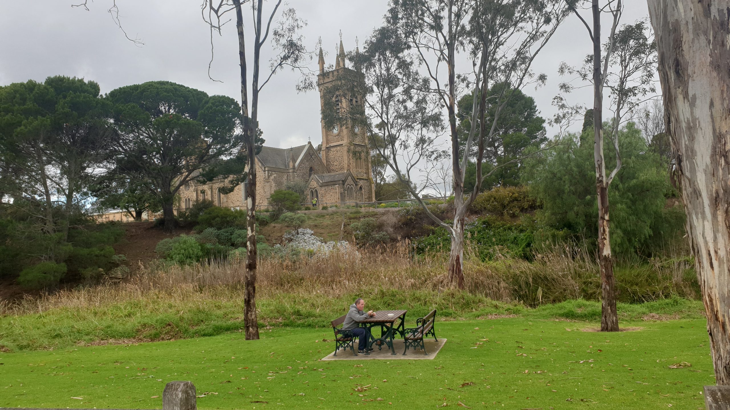 Breakfast in Strathalbyn park next to river and a lovely church.